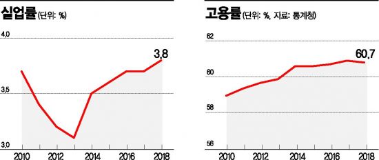 고용노동부에서 발표하는 실질임금상승률도 유사하다. 2018년 상승률은 3.7%로 2017년 1.3% 대비 2.4%포인트 올랐다. 그러나 고용부의 임금상승률 통계는 사업체의 현재 근무자들 임금만을 바탕으로 집계했다. 실업률이나 고용률은 전혀 반영되지 않다는 점에서 한은이 집계한 근로자 명목 임금상승률과 성격이 다르다.