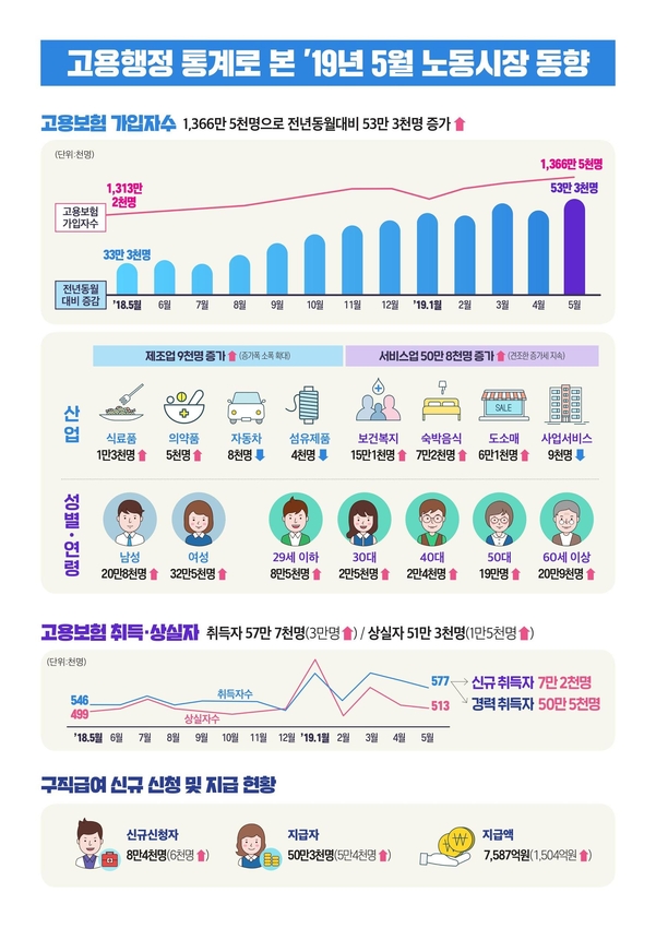 지난달 고용보험 가입자 수는 1366만5000명으로, 전년동기 대비 53만3000명(4.1%) 늘었다. 월별 피보험자 증가 폭으로는 2012년 2월 이후 7년 3개월 만에 가장 큰 폭이었다. 서비스업이 가장 크게 증가했다. 서비스업의 가입자는 924만3000명으로, 지난해보다 50만8000명(5.8%) 증가했다. 분야별로는 보건복지 분야가 15만1000명으로 가장 많았고, 숙박음식 7만2000명, 전문과학기술 4만8000명, 교육서비스 4만7000명 등의 순이었다. 고용부는 "실업급여 신규 신청는 경제활동 인구나 전체 실업자 규모에서 차지하는 비중이 얼마 안돼 실업급여액이 늘었다고해서 고용 상황이 나빠졌다고 보는 것은 곤란하다"고 했다.