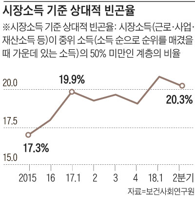 우리나라의 상대적 빈곤율이 작년 1분기(1~3월)에 사상 처음으로 20%를 넘어선 것으로 조사됐다. 5명 중에 1명은 저소득층으로 분류된다는 뜻이다. 이들의 소득은 소득순으로 순서를 매겼을 때 한가운데인 중위소득의 절반에도 못 미친다. 경기 침체 등과 함께 최저임금의 급격한 인상이 경제적 약자(弱者)인 저소득층의 일자리를 사라지게 하면서 소득 하락으로 이어졌을 가능성이 거론된다. 소득 주도 성장을 위한 최저임금 과속 인상이 역효과를 냈다는 것이다. 국책 연구원인 보건사회연구원의 '2018년 빈곤통계연보'의 분석 내용이다.