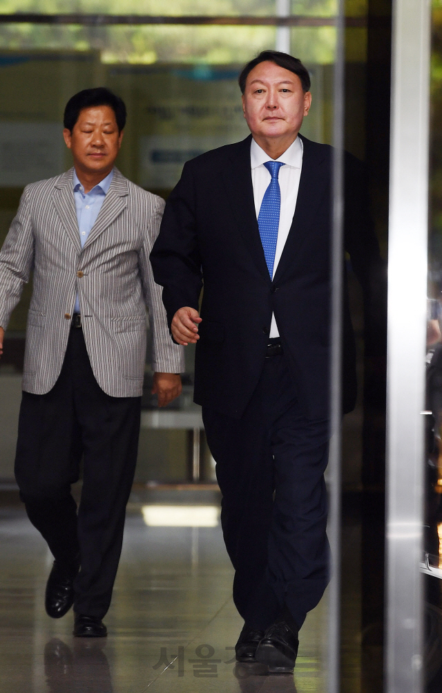 윤석열(오른쪽) 서울중앙지검장이 17일 서울 서초구 서울중앙지검 청사를 나서고 있다. 문재인 대통령은 이날 신임 검찰총장 후보자에 윤 지검장을 지명했다./오승현기자 2019.6.17