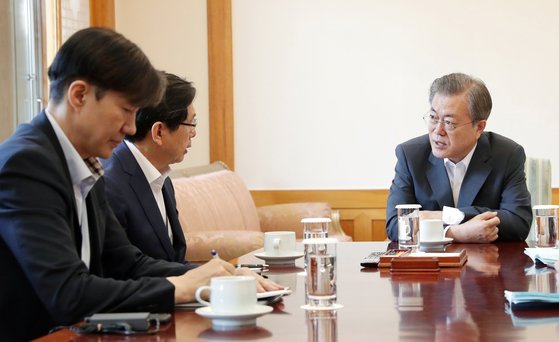 문재인 대통령이 17일 오전 청와대 관저에서 박상기 법무부 장관(가운데)으로부터 차기 검찰총장 임명제청 건에 관한 보고를 받고 있다. 왼쪽은 조국 민정수석. 청와대 제공 |