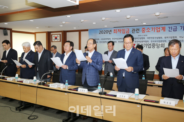 중소기업중앙회와 소상공인연합회, 한국여성경제인협회 등 15개 중소기업 단체는 18일 서울 여의도 중기중앙회에서 긴급 기자회견을 열고 ‘2020년 최저임금에 대한 중소기업계 입장’을 발표했다.