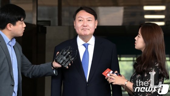 (서울=뉴스1) 민경석 기자 = 신임 검찰총장 후보자로 지명된 윤석열 서울중앙지검장이 17일 서울 서초구 서울중앙지방검찰청을 나서며 취재진의 질문을 받고 있다. 2019.6.17/뉴스1 <저작권자 © 뉴스1코리아, 무단전재 및 재배포 금지> |