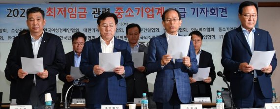 중기업계를 대표하는 중소기업중앙회를 비롯해 소상공인연합회, 한국여성경제인협회, 벤처기업협회, 한국외식업중앙회 등 우리나라 소상공인·중소기업계를 대표하는 15개 협·단체는 18일 서울 여의도 중기중앙회에 모여 2020년 적용 최저임금 긴급간담회를 열고 내년도 적용 최저임금은 최소한 동결해야 한다고 주장했다.