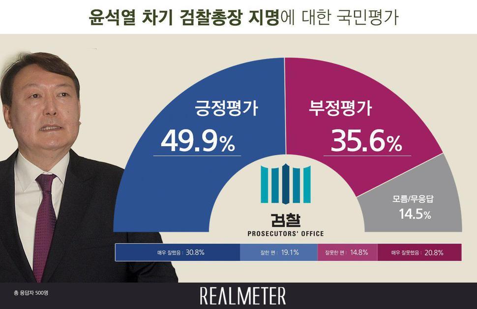 리얼미터가 <오마이뉴스> 의뢰로 지난 18일 전국 19세 이상 성인 500명을 대상으로 윤석열 차기 검찰총장에 대한 국민의식을 조사(신뢰수준 95%, 표본오차 ±4.4%포인트)한 결과 ‘잘했다’는 긍정평가가는 49.9%로 집계됐다. ‘잘못했다’는 부정평가(35.6%)보다 14.3%포인트 높았다.
