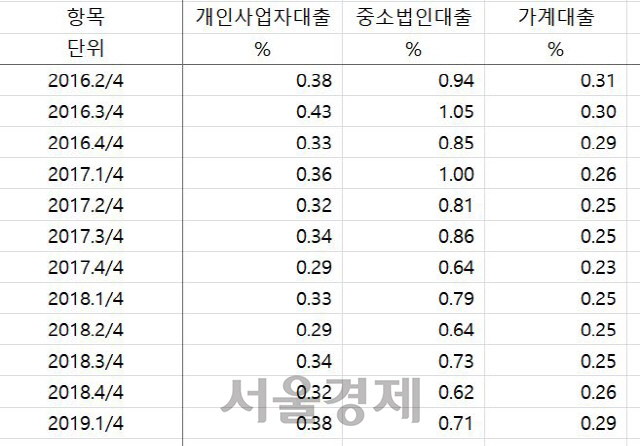 이에 대출 연체율도 상승 중이다. 2019년 1·4분기 개인사업자의 대출 연체율은 0.38%로 전기 대비 0.06% 포인트 증가했다. 2016년 3·4분기 0.34%이후 최고 수치이기도 하다.