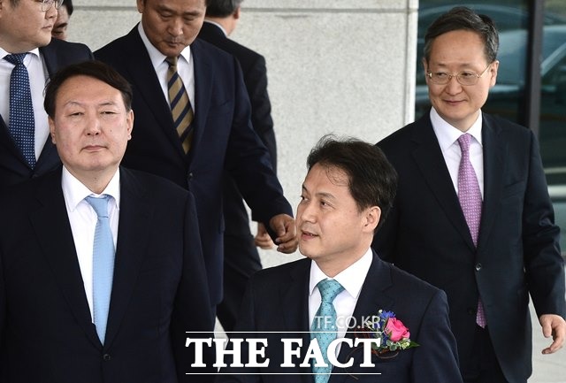 2017년 5월 김주현(가운데) 전 대검차장 이임식에 참석한 봉욱 대검차장(오른쪽)과 윤석열 서울중앙지검장(왼쪽 끝)./뉴시스 |