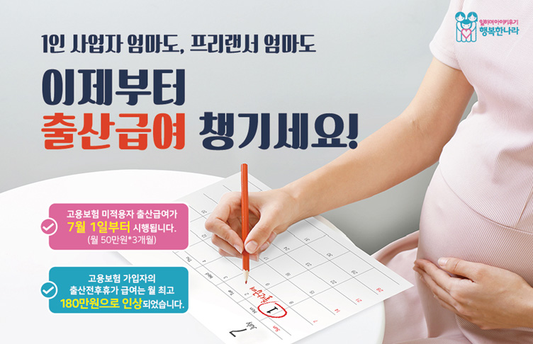 23일 고용노동부에 따르면 7월 1일부터 소득활동을 하면서도 고용보험의 출산전후휴가 급여를 지급받지 못했던 여성은 월 50만 원씩 3개월 동안 총 150만 원의 출산 급여를 지급받을 수 있다.