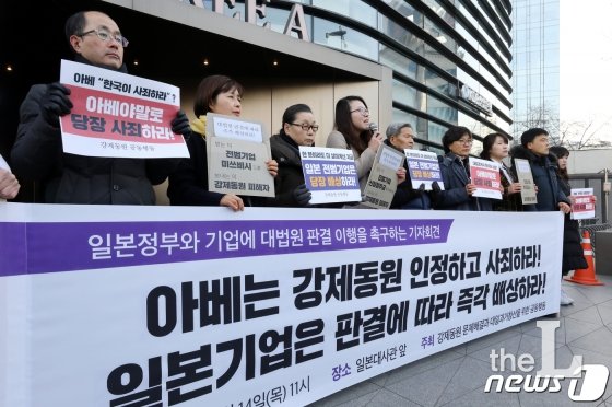한편 대법원 전원합의체는 지난해 10월30일 이춘식씨 등 강제징용 피해자 4명이 신일철주금을 상대로 낸 손해배상 청구 소송의 재상고심에서 '강제징용은 반인도적 불법행위이므로 1965년 한·일 정부 간 청구권협정이 있었더라도 개인별 위자료를 요구할 수 있다'는 취지로 전범기업의 손해배상 책임을 인정했다.