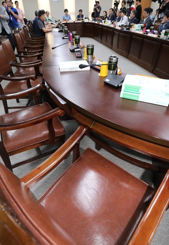 사용자측 불참 '텅빈'회의장 내년 최저임금 심의 법정기한인 27일 정부세종청사에서 열린 최저임금위원회 전원회의장이 사용자위원들의 불참으로 비어 있다. 사용자위원들은 지난 26일 최저임금 업종별 차등적용 무산에 반발, 집단퇴장한 후 이날 회의에도 불참했다.뉴시스 |