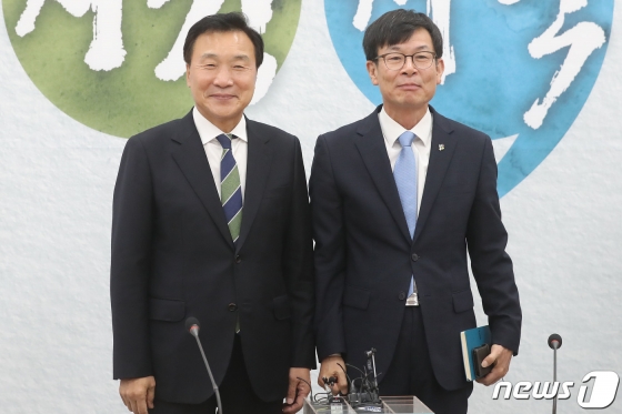 김상조 청와대 정책실장이 28일 오전 서울 여의도 국회에서 손학규 바른미래당 대표를 예방, 기념촬영을 하고 있다/사진=뉴스1 |