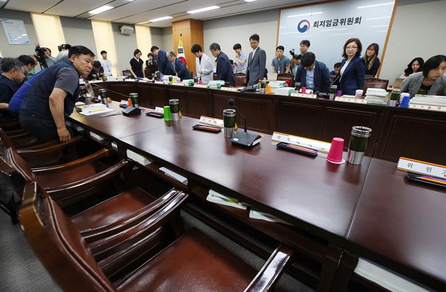 내년 최저임금 심의 법정기한인 지난달 27일 세종시 정부세종청사에서 열린 최저임금위원회 제6차 전원회의에 사용자 위원 전원이 불참해 자리가 비어있다. 연합뉴스 |