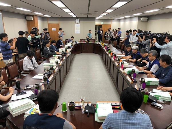 최저임금위원회 6차 전원회의가 6월 27일 정부세종청사에서 열렸다. 이날 회의는 사용자 위원 9명 전원이 참석하지 않은 가운데, 개회 1시간 30분 만에 끝났다. / 세종=박진우 기자 |