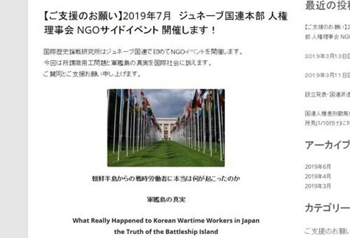 ▲ 일본 '국제역사논전연구소'가 홈페이지에 올린 '군함도 역사 왜곡' 심포지엄 개최 알림글