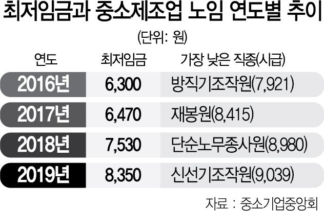3일 중소기업중앙회가 중소제조업 1,300개 업체(매출액 30억원 이상·종사자 수 10인 이상·3월 말 현재)의 임금을 전수 조사한 바에 따르면, 129개 직종 중 가장 시급이 낮은 직종인 신선기조작원은 9,039원이다. 올해 최저임금(8,350원)과의 차이가 689원에 그쳤다. 신선기조작원은 구리, 알루미늄 등의 선재를 가공하는 기계를 다룬다.