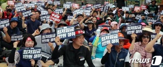 민주노총 조합원들이 지난달 27일 정부세종청사 고용노동부 앞에서 최저임금 1만원 인상 결의대회를 하고 있다. /사진=뉴스1 |