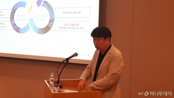 이상백 에이스토리 대표가 4일 서울 여의도에서 개최한 IPO(기업공개) 간담회에서 발표하고 있다. /사진제공=에이스토리 |