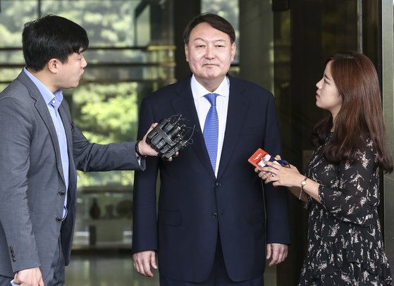 윤석열 서울지검장이 17일 오전 서울 서초동 서울지검을 나서며 기자들의 질문을 받고 있다. 임현동 기자 |