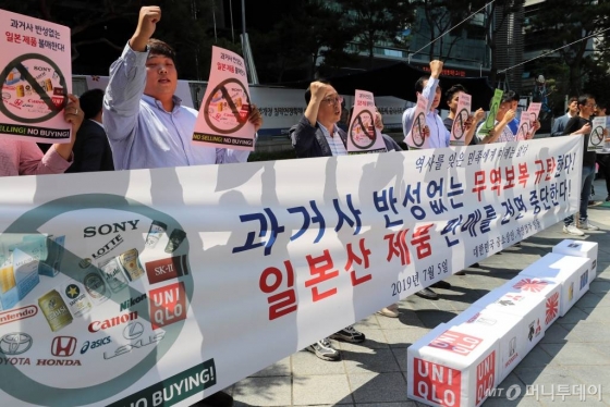한국중소상인자영업자총연합회(이하 한상총)는 5일 서울 종로구 옛 일본대사관 앞에서 기자회견을 열고 "과거사 반성 없이 무역보복을 강행하는 일본을 규탄한다"며 일본제품 판매를 중지한다고 밝혔다.
