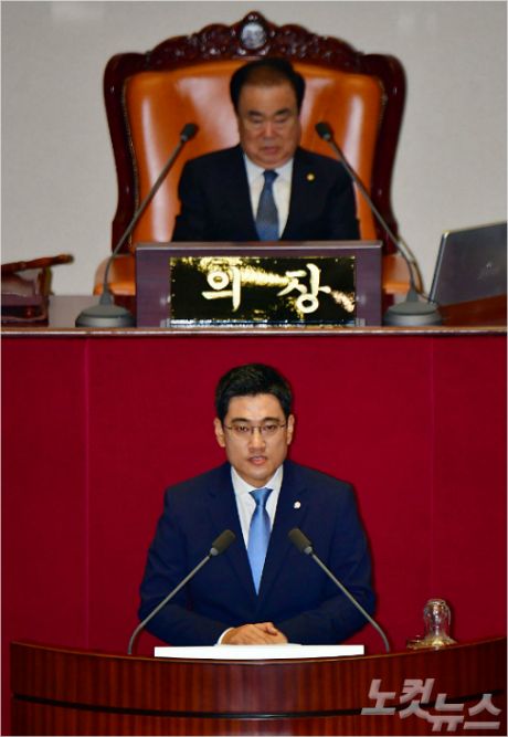 바른미래당 오신환 원내대표가 5일 오전 국회 본회의에서 교섭단체대표연설을 하고 있다. 윤창원기자 |