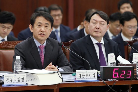 지난해 10월 박정식 서울고등검찰청장(왼쪽)이 서울 서초구 서울고등검찰청에서 열린 국회 법제사법위원회 국정감사에서 의원 질의에 답하고 있다. 오른쪽은 윤석열 서울중앙지검장. [뉴스1] |