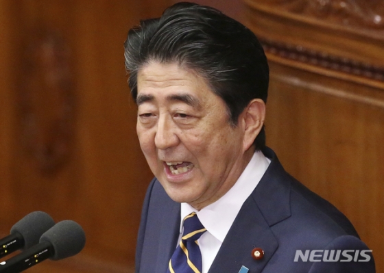 【도쿄=AP/뉴시스】아베 신조 일본 총리가 28일 도쿄서 국회 시정연설을 하고 있다. 아베 총리는 시정 연설에서 한국은 언급하지 않고 북한과의 관계 개선 등만을 언급했다. 총리관저가 사전 배포한 연설문을 보면 그간 아베 총리의 연설에 한국 관련 부분은 비중이 크든 작든 빠지지 않았지만 올해는 사라졌다. 2019.01.28. <저작권자ⓒ 공감언론 뉴시스통신사. 무단전재-재배포 금지.> |