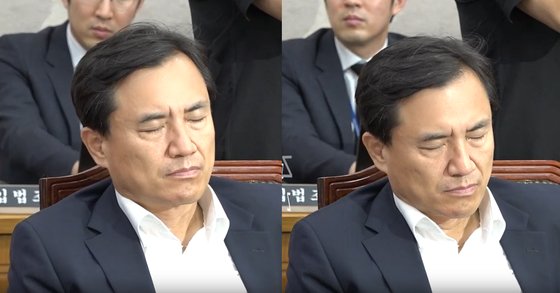8일 열린 윤석열 검찰총장 후보자의 인사청문회장에서 김진태 자유한국당 의원이 눈을 감고 조는 듯한 모습이 포착됐다. 한 유튜브 1인미디어는 김 의원이 수 분간 눈을 감고 고개를 '끄덕끄덕'하는 모습을 담은 영상을 공개했다.