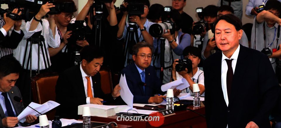 윤석열(맨 오른쪽) 검찰총장 후보자가 8일 국회에서 열린 인사청문회에서 선서문을 법제사법위원장에게 제출한 뒤 자리로 돌아가고 있다. 윤 후보자는 이날 정부·여당이 추진하는 검경 수사권 조정안의 핵심인 검찰의 수사지휘권 폐지에 대해 부정적인 입장을 밝힌 반면 공수처 설치에는 찬성한다고 했다. /이덕훈 기자 |