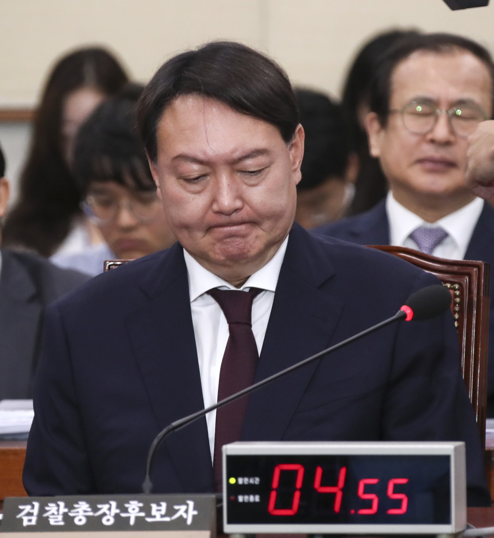 윤석열 검찰총장 후보자의 인사청문회가 8일 국회 법제사법위원회 전체회의장에서 열렸다. 윤 후보자가 입을 굳게 다물고 여야 의원들의 설전을 듣고 있다. 임현동 기자 |