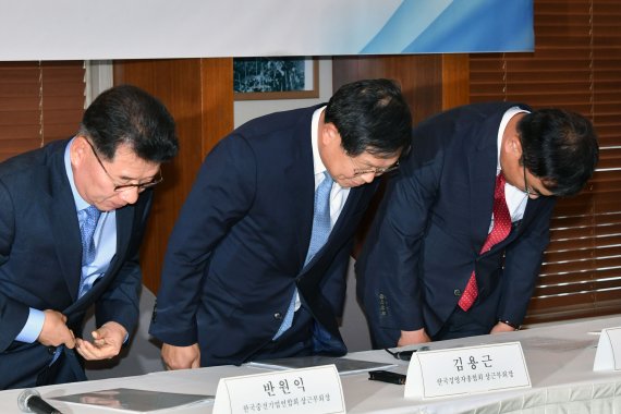 한국경영자총협회(이하 경총), 중소기업중앙회(이하 중기중앙회), 한국중견기업연합회(이하 중견련)가 9일 오전 서울 세종대로 한국프레스센터 외신기자클럽에서 2020년 적용 최저임금 결정에 대한 주요 사용자단체 공동 기자회견을 개최, 반원익 중견련 상근 부회장(왼쪽부터), 김용근 경총 상근 부회장, 서승원 중기중앙회 상근 부회장이 공동입장문을 발표 후 인사하고 있다. 사진=서동일 기자