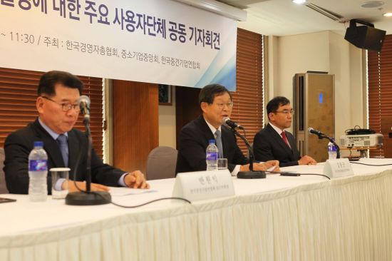 한국경영자총협회, 중소기업중앙회, 한국중견기업연합회 등 사용자단체가 9일 서울 중구 프레스센터에서 공동 기자회견을 열어 최저임금 삭감을 주장했다. 사진은 (왼쪽부터) 반원익 중견련 상근부회장, 김용근 경총 상근부회장, 서승원 중기중앙회 상근부회장(사진=경총) |