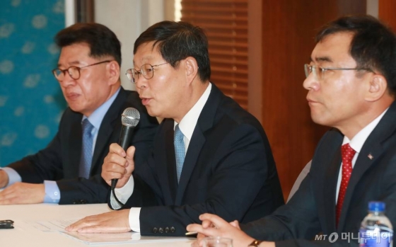 9일 오전 서울 중구 한국프레스센터에서 한국경영자총협회·중소기업중앙회·한국중견기업연합회 주최로 열린 2020년 적용 최저임금 결정에 대한 주요 사용자단체 공동기자회견에서 김용근 경총 상근부회장(가운데)이 취재진의 질문에 답하고 있다./사진=이동훈 기자 |