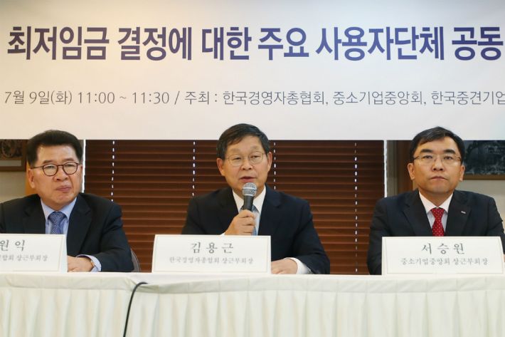반대로 사용자단체들은 최저임금 인하를 거듭 주장했다. 경총과 중기중앙회, 한국중견기업연합회는 이날 서울 프레스센터에서 공동 기자회견을 열고 "친노동정책으로 글로벌 금융위기 때보다 경제 심리도 훼손된 상황"이라며 이같이 주장했다.