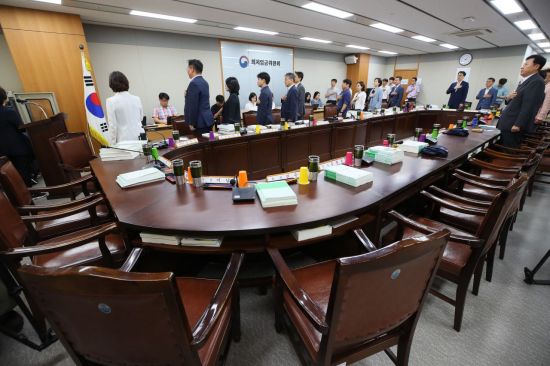 노동계가 경영계의 최저임금 삭감안 등에 반발해 불참한 가운데 9일 세종시 정부세종청사 고용노동부에서 열린 최저임금위원회 제10차 전원회의에 근로자 위원들의 자리가 모두 비어있다. [이미지출처=연합뉴스] |