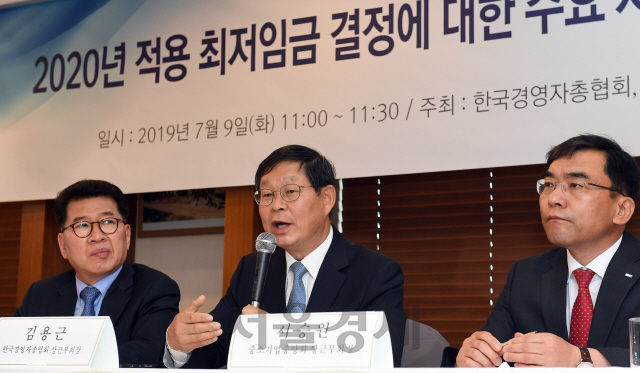 김용근 한국경영자총협회 상근부회장이 9일 한국프레스센터에서 열린 ‘2020년 적용 최저임금 결정에 대한 주요 사용자단체 공동 기자회견’에서 내년도 최저임금을 4.2% 삭감해야 한다고 재차 강조했다. 이에 반발해 노동계는 이날 오후 예정된 최저임금위원회 회의에 전원 불참했다. 반원익(왼쪽부터) 한국중견기업연합회 상근부회장, 김 상근부회장, 서승원 중소기업중앙회 상근부회장. ★관련기사 6면 /이호재기자
