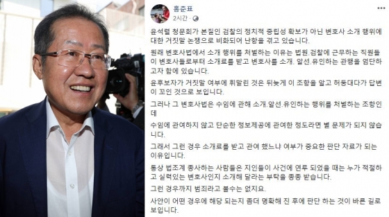 홍 전 대표는 "윤 후보자가 거짓말 논란에 휘말린 것은 뒤늦게 이 조항을 알고 허둥대다 답변이 꼬인 것으로 보인다"며 "그러나 변호사법은 수임에 관해 소개·알선·유인하는 행위를 처벌하는 조항인데 수임에 관여하지 않고 단순한 정보제공에 관여한 정도라면 별 문제가 되지 않는다"고 설명했다.