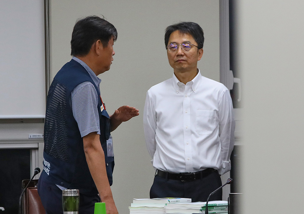 박준식 최저임금위원장(오른쪽)과 근로자위원인 김만재 금속노조연맹위원장이 11일 저녁 세종시 정부세종청사 고용노동부에서 열린 최저임금위원회 전원회의에서 정회 기간 도중 대화하고 있다.(연합뉴스) |