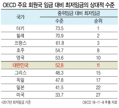 다만 이같은 2017년 통계가 최신자료이다. 문재인 정부가 들어서기 전에 확정된 최저임금 6470원이 반영된 수치다. 내년까지 3년 간 약 33% 상승한다는 점을 고려하면 순위는 5위권 내외로 올라설 전망이다.