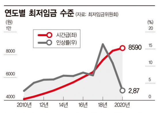 이번 최저임금 인상률은 2010년 2.75% 이후 10년 만에 가장 낮다. 최저임금제도가 도입된 1988년 이후 역대 세번째로 낮은 수준이다. 2017년 출범한 문재인 정부 들어서도 가장 낮은 인상률이다.