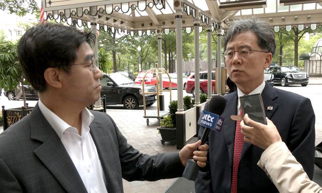 미국을 방문중인 김현종 청와대 국가안보실 2차장이 워싱턴DC의 숙소인 호텔 앞에서 취재진의 질문에 답변하고 있다. 워싱턴=연합뉴스 |