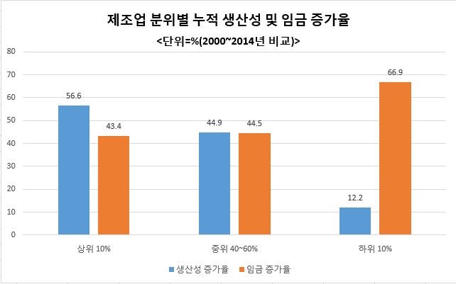이 교수는 "(하위 기업들의) 미약한 생산성 증가에도 상당한 임금 상승이 나타난 것은 2000년대 빨라진 최저임금 인상과 정책적 노력 등 인위적 개입 때문"이라며 "이는 언제가 한계에 봉착할 것"이라고 지적했다. 그는 그러면서 "장기적인 임금 상승을 보장하는 것은 생산성 증가"라고 강조했다.