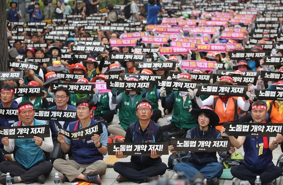 15일 오후 서울 여의도 국회 앞에서 열린 '노동개악 저지·노동기본권 쟁취·비정규직 철폐·재벌개혁·노동탄압 분쇄·최저임금 1만원 폐기규탄 민주노총 결의대회'에서 참가자들이 구호를 외치고 있다. [뉴시스] |