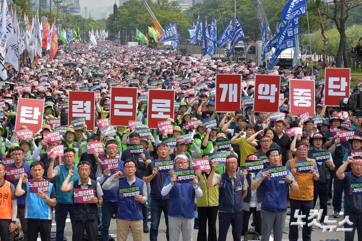 18일 오후 서울 여의도 국회 앞에서 열린 민주노총 총파업 대회에서 조합원들이 구호를 외치고 있다. 민주노총은 탄력근로제 확대와 최저임금 공약 파기에 반발하며 총파업에 돌입했다.
