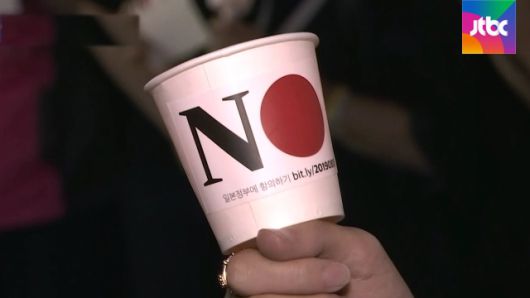 시민들이 들고 있는 LED 초인데요, 일장기를 이용해서 'NO'라고 적어 놓았고, 그 밑에는 작은 글씨로 일본 정부에 항의하기라고 적어놓았습니다.