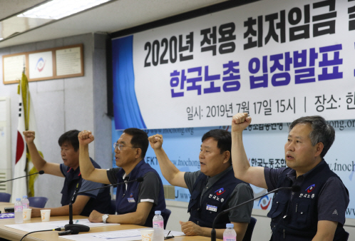 지난 17일 오후 서울 여의도 한국노총 대회의실에서 열린 2020년 적용 최저임금 결정안에 대한 한국노총 입장발표 기자회견에서 김주영 한국노총 위원장(왼쪽 두번째부터)은 최저임금 이의제기서를 내겠다고 밝혔다. 연합뉴스 제공. |