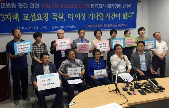 근로정신대 할머니와 함께하는 시민모임이 23일 광주시의회 1층 시민소통실에서 기자회견을 하고 "전범기업 미쓰비시는 대법원 판결을 즉각 이행하라"고 촉구하고 있다. [뉴스1] |
