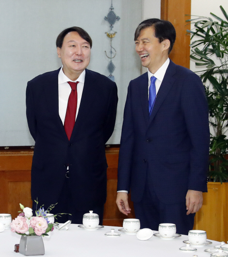 조국(오른쪽) 청와대 민정수석과 윤석열 신임 검찰총장이 25일 오전 청와대에서 열린 윤 총장의 임명장 수여식에 앞서 열린 차담회에서 얘기를 나누며 웃고 있다. (사진=연합뉴스) |