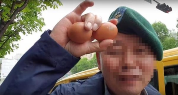 지난 4월 보수성향 유튜버 김상진씨가 윤석열 당시 서울중앙지검장 집 앞에서 달걀 2개를 들고 방송하고 있다. /유튜브 캡처 |