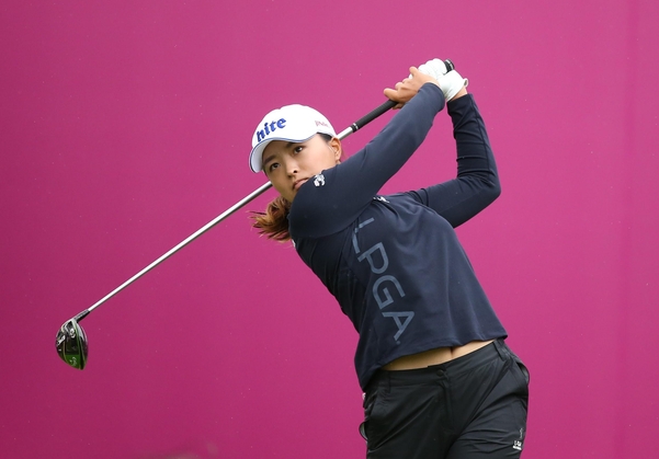 고진영이 에비앙 챔피언십 최종 4라운드 1번 홀에서 티샷을 날리고 있다./LG전자 |