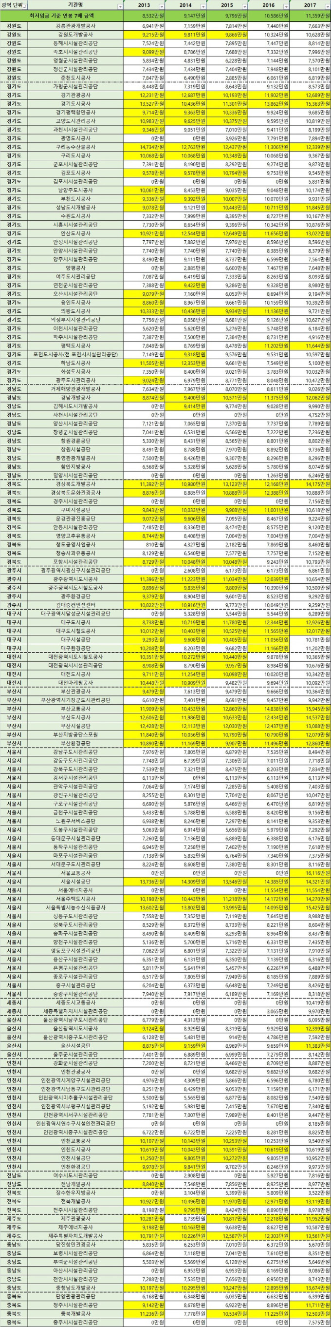 6일 투명사회를 위한 정보공개센터(투명센터)가 지방공공기관 경영공시 사이트 '클린아이'를 통해 151개 지방공기업 기관장 연봉을 분석한 결과 지난 5년(2013년~2017년)간 매년 최저임금의 7배 이상 연봉을 제공한 기관은 총 19곳에 달했다.